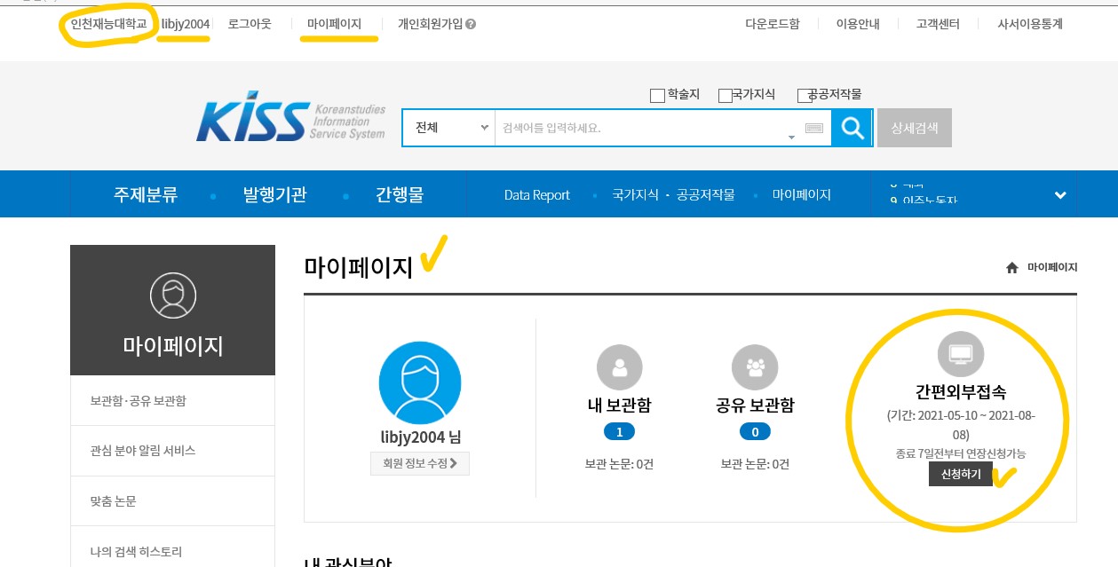 ±â°üÀÎÁõÀ» ÅëÇØ ·Î±×ÀÎÇÏ¿© ÀÌ¿ëÇÒ ¼ö ÀÖ½À´Ï´Ù. * ±â°üÀÎÁõ¹æ¹ý * Çб³ Æ÷ÅÐ(JEIU portal) ·Î±×ÀÎ> ÇмúÁ¤º¸°ü ¾È³»> ÇмúÁ¤º¸°ü ȨÆäÀÌÁö ÇÏ´ÜÀÇ ¹è³Ê ¸µÅ© ¶Ç´Â ¸Þ´º> ÀüÀÚÁ¤º¸> ÀüÀÚÀú³Î¿¡¼ ÇØ´ç Àú³ÎÀ» ã¾Æ ¸µÅ© Á¢¼Ó ¡Ø ´Ü, Çб³ ÀÌ¿ÜÀÇ Àå¼Ò(±³¿Ü Á¢¼Ó)¿¡¼ ·Î±×ÀÎÇϱâ À§Çؼ´Â, ±³³» Wifi·Î Á¢¼ÓÇÑ PC ¶Ç´Â ÇмúÁ¤º¸°ü °Ë»ö´ë¿¡¼ À§¿Í µ¿ÀÏÇÑ ¹æ¹ý(±â°ü ÀÎÁõ)À¸·Î ÇØ´ç DB¿¡ ·Î±×ÀÎÇÑ ÈÄ, °³ÀΰèÁ¤À» »ý¼º/¿¬µ¿ÇÏ¿© ±³¿Ü¿¡¼µµ ÀÌ¿ëÇÒ ¼ö ÀÖÀ½. 1. DBpia : ±â°üȸ¿øÀ¸·Î ·Î±×ÀÎÇÑ »óÅÂ> °³ÀΰèÁ¤À¸·Î ·Î±×ÀÎ ÈÄ, À̸§ ¿·ÀÇ ¼ýÀÚ°¡ ±³¿Ü Á¢¼ÓÀÌ °¡´ÉÇÑ ±â°£ÀÔ´Ï´Ù. 90Àϰ£ Çб³ Æ÷ÅÐÀ̳ª ÇмúÁ¤º¸°ü ȨÆäÀÌÁö¸¦ ÅëÇÏÁö ¾Ê°íµµ Á¢¼Ó ¹× ÀÌ¿ëÀÌ °¡´ÉÇÕ´Ï´Ù. ![]() 2. KISS : ±â°üȸ¿øÀ¸·Î ·Î±×ÀÎÇÑ »óÅÂ> °³ÀΰèÁ¤À¸·Î ·Î±×ÀÎ ÈÄ, ¸¶ÀÌÆäÀÌÁö¿¡¼ °£Æí¿ÜºÎÁ¢¼ÓÀ» ½ÅûÇÒ ¼ö ÀÖ½À´Ï´Ù. ½Åû ÈÄ 90Àϰ£ Çб³ Æ÷ÅÐÀ̳ª ÇмúÁ¤º¸°ü ȨÆäÀÌÁö¸¦ ÅëÇÏÁö ¾Ê°íµµ Á¢¼Ó ¹× ÀÌ¿ëÀÌ °¡´ÉÇÕ´Ï´Ù. ![]() 3. ±×¿Ü ÀüÀÚÀú³Î: KERIS ´ëÇÐ ¶óÀ̼±½º ±¸µ¶(PAO KERIS collection, AVON, The Vogue Archive, GVRL, Emeral specialist Collection, Nursing Reference Center, Music and Dance Online, O'Reilly Higher Education) * KERIS °³ÀÎ °èÁ¤ »ý¼º/·Î±×ÀÎ> ³»Á¤º¸> ±â°üȸ¿ø¼ºñ½º ¼³Á¤ • ±¸µ¶ ÀüÀÚÀú³Î - ±³³» : IPÀÎÁõÀ» ÅëÇØ ±³³» ȨÆäÀÌÁö¿¡¼ Á÷Á¢ ÀÌ¿ë °¡´É - ±³¿Ü : RISS¸¦ ÅëÇÏ¿© °³ÀÎ ·Î±×ÀÎ ÈÄ, 24½Ã°£ ¾ðÁ¦µçÁö À̿밡´É • ºñ±¸µ¶ ÀüÀÚÀú³Î - RISS¸¦ ÅëÇÏ¿© °³ÀÎ ·Î±×ÀÎ ÈÄ, 24½Ã°£ ¾ðÁ¦µçÁö À̿밡´É ⇒ MyRISS> ¼ºñ½º»ç¿ë±ÇÇÑ¿¡¼ À̿밡´ÉÇÑ ÇмúDB È®ÀÎ ![]() |