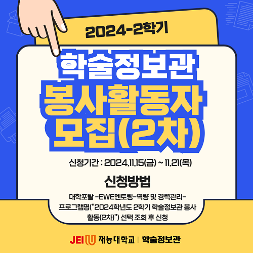 °¡. ´ëÇÐÆ÷Å» -> EWE ¸àÅ丵 -> ¿ª·® ¹× °æ·Â°ü¸® -> ¿ª·® °³¹ß ±³À° ½Åû´ã´çºÎ¼ "ÇмúÁ¤º¸°ü" / ÇÁ·Î±×·¥¸í "2024Çг⵵ 2Çбâ ÇмúÁ¤º¸°ü ºÀ»çȰµ¿(2Â÷)" ¼±Åà Á¶È¸) -> Á¶È¸µÈ ÇÁ·Î±×·¥ ¼±Åà ÈÄ ½ÅûÅÇ Å¬¸¯